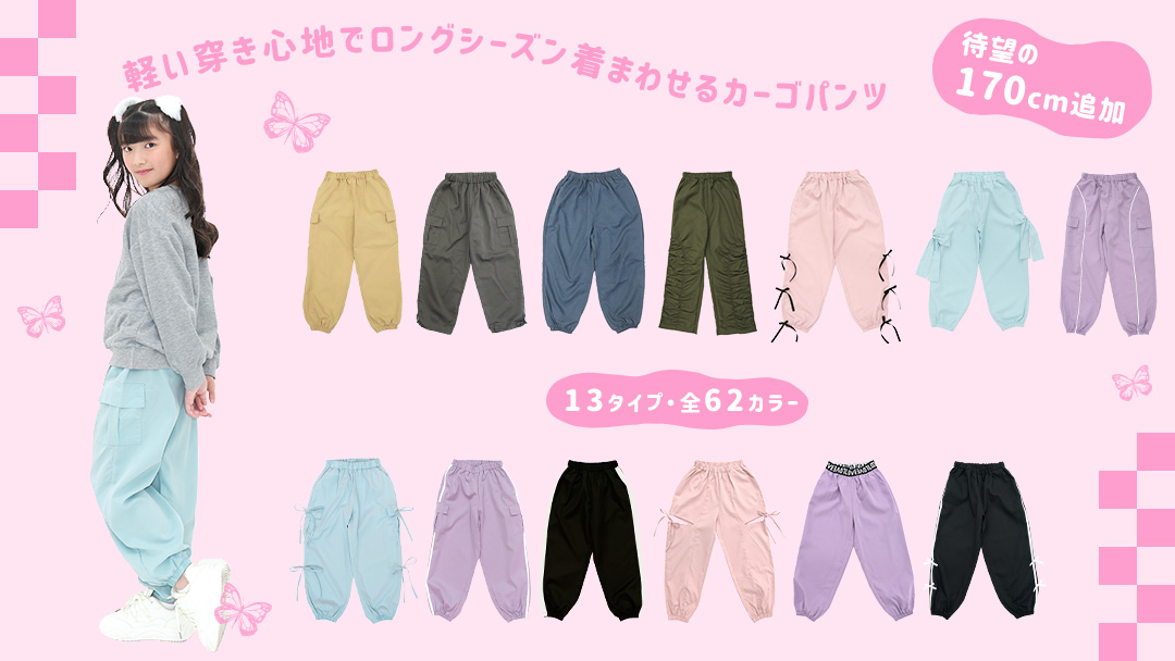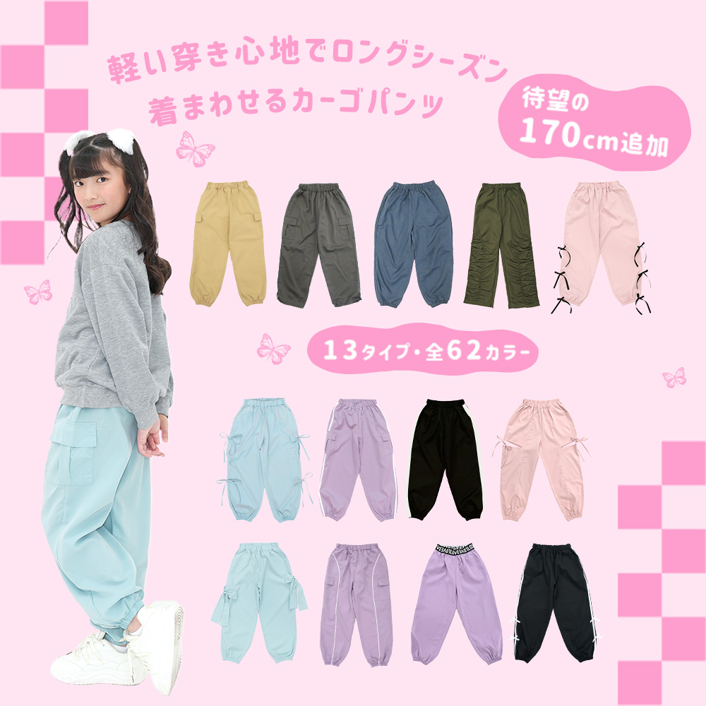 豊富なカラバリから選べるのが嬉しい。男女兼用のカーゴパンツからリボン付きのデザインまで展開中。オールシーズン着用でき、160cmはママも着用可能です。ウエストゴムで脱着も楽ちんで通学にもおすすめです。 カーゴパンツ ジョガーパンツ ¥ 1,236 税込 お気に入りに登録する