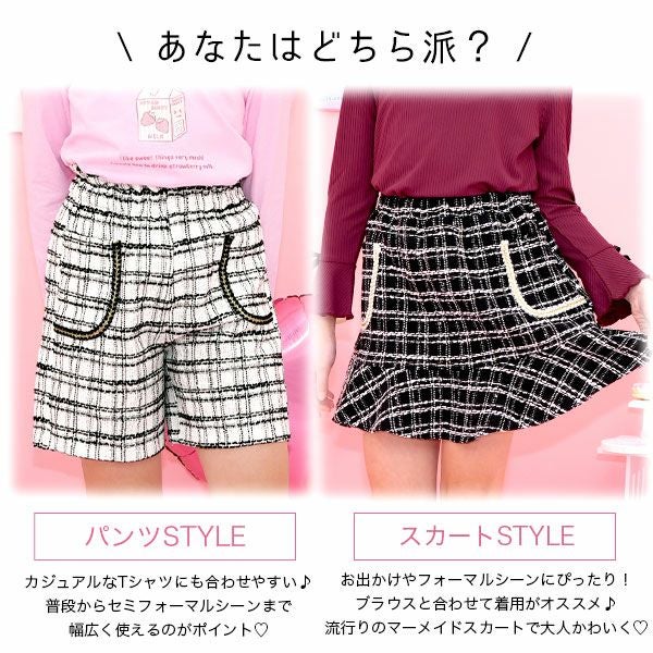 他の画像を見る ツイードのスカートとパンツから選べる。大人顔負けのデザインでオシャレなコーデの完成。さらにジャケットとセットアップでの着用が可能。お出かけにはもちろんフォーマルシーンでも場所を問わず大活躍な1枚です! ツイードボトムス 通常 ¥ 1,576 のところ ¥ 1,419 税込 カートに入れる お気に入りに登録する