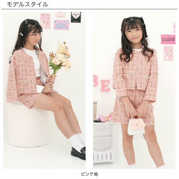 大人顔負けデザインのジャケット登場。ラメ入りのツイードがコーデの格を上げてくれる。別売りのスカートやショートパンツとセットアップでの着用可能。フォーマル、お出かけなど様々なシーンで着られる1枚です。 ツイードジャケット