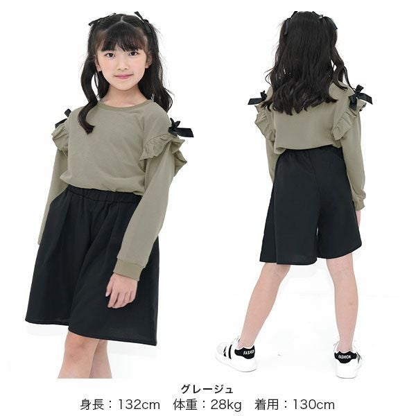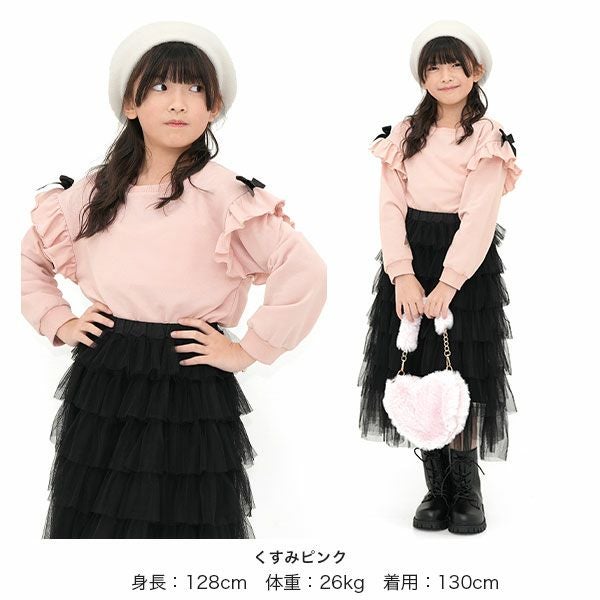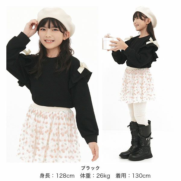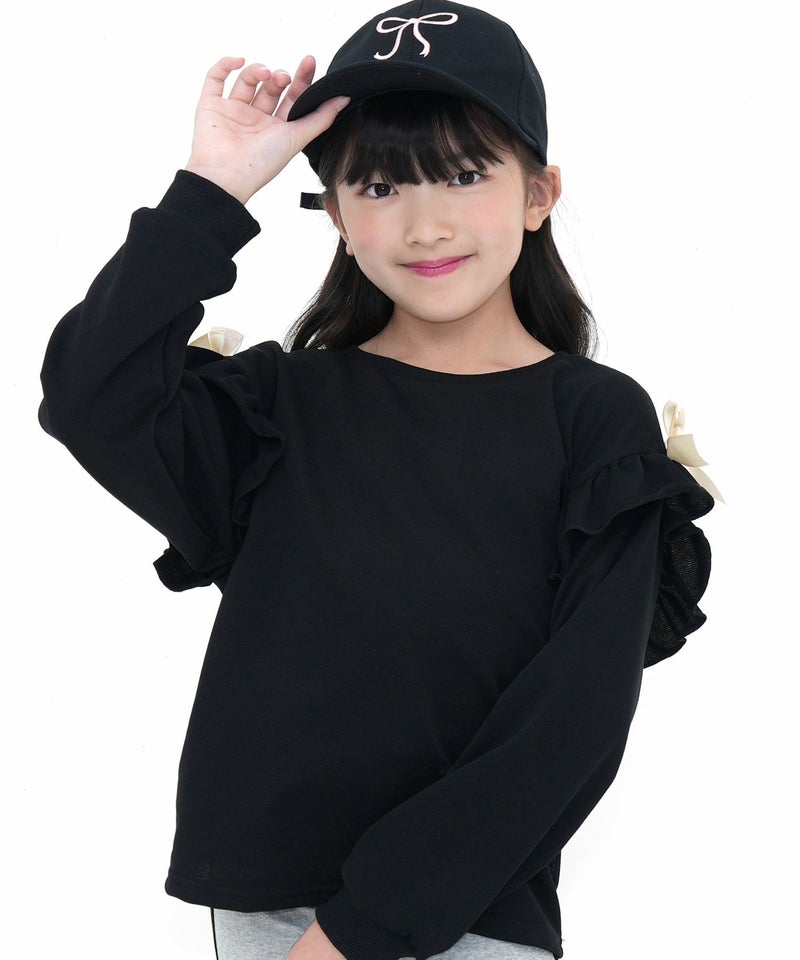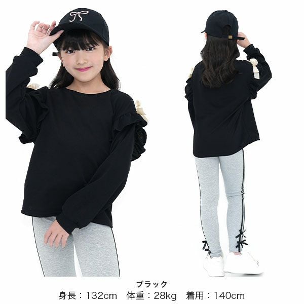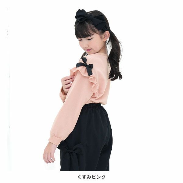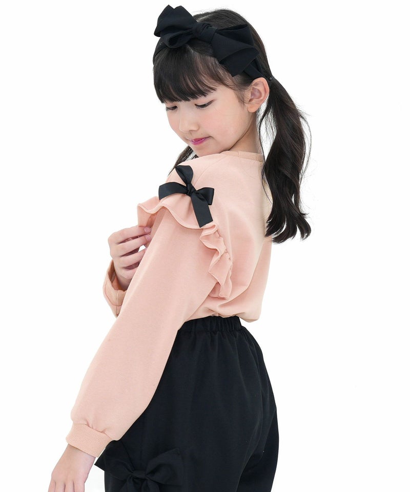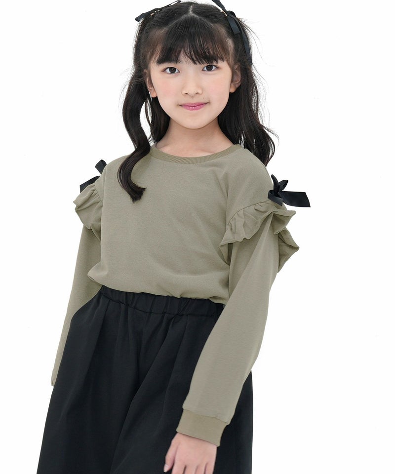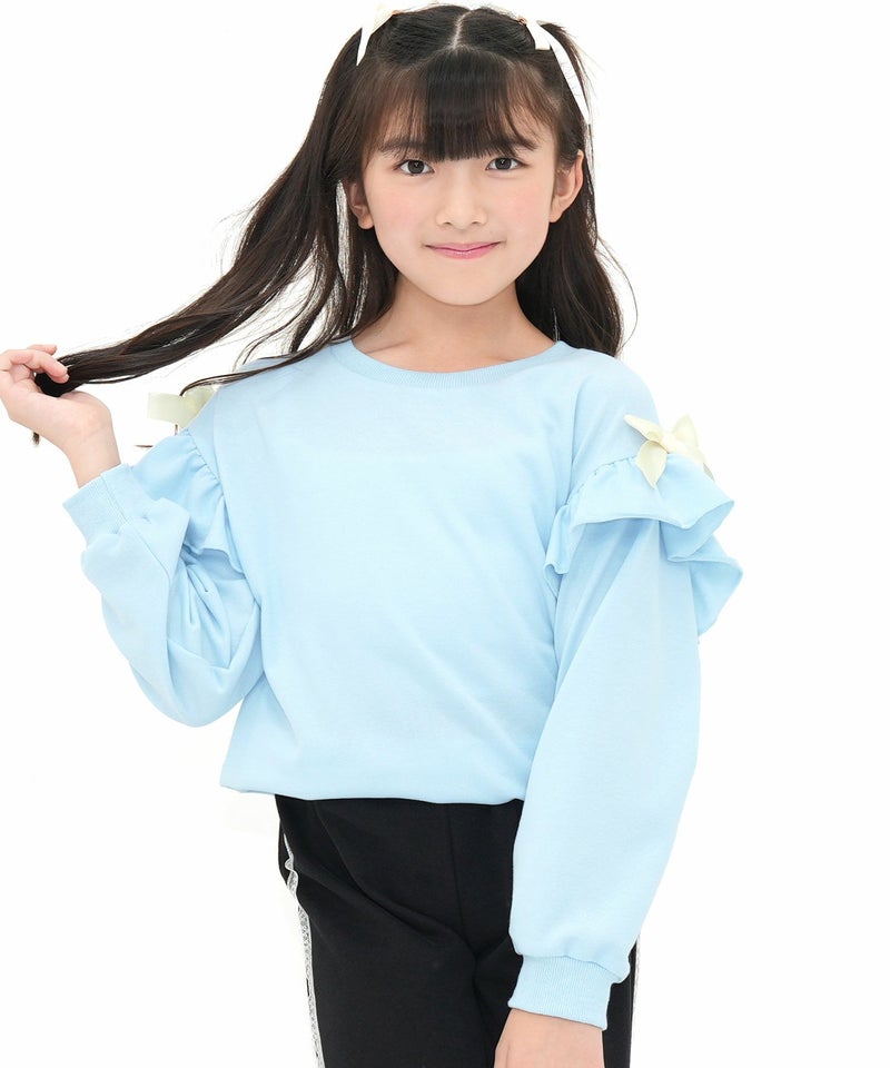 シンプルながらも可愛いをおさえたフリルトップス。サイドのリボンがアクセントになりコーデをぐっと可愛い印象に。柔らかい生地感なのでトップスをインしたり、ジャンパースカートとも相性抜群。 リボンフリルトップス