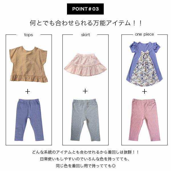 プチプラでカラバリ豊富な無地レギンス!毎日はくものだから価格も着心地も妥協したくない。伸縮性のある柔らかい生地感で履き心地抜群です。通園通学やワンピース下の着用にも。 無地レギンス