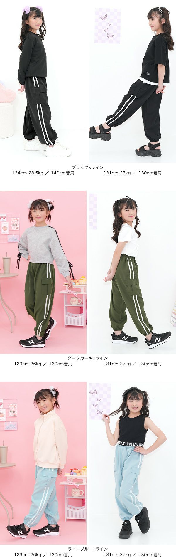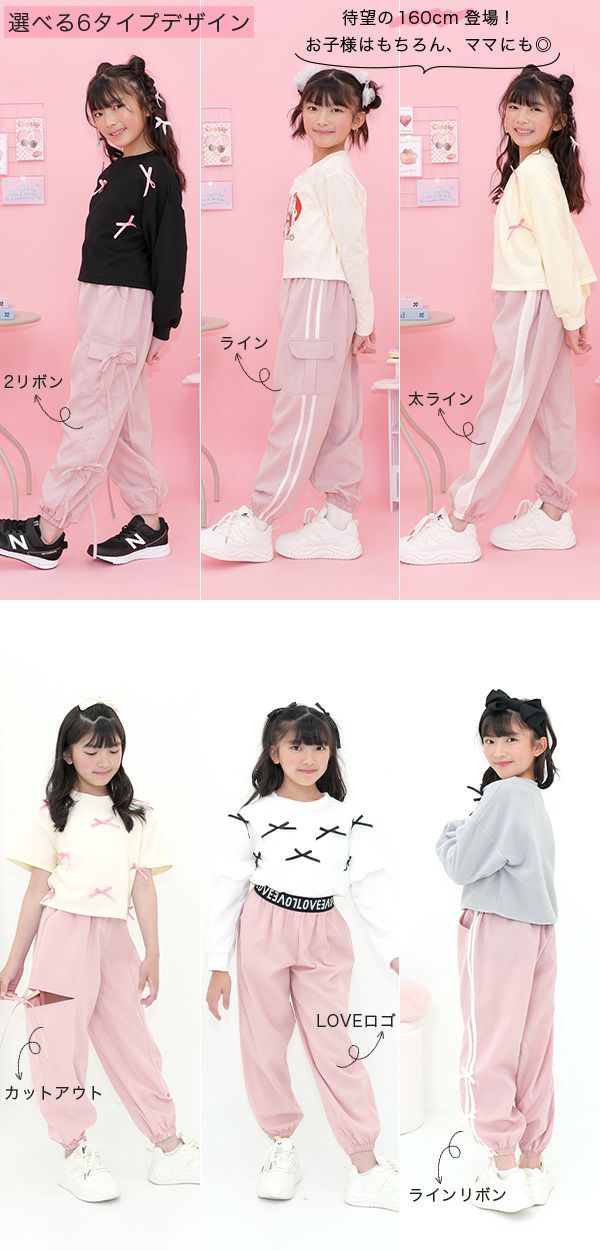 豊富なカラバリから選べるのが嬉しい。男女兼用のカーゴパンツからリボン付きのデザインまで展開中。オールシーズン着用でき、160cmはママも着用可能です。ウエストゴムで脱着も楽ちんで通学にもおすすめです。 カーゴパンツ・ジョガーパンツ